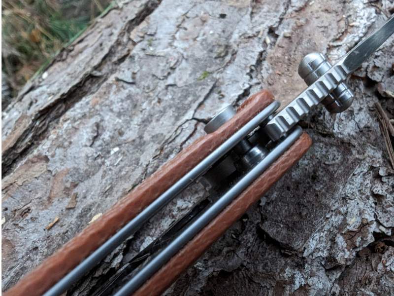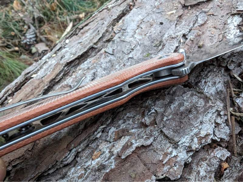 As a hybrid thumb flipper with a button lock you have multiple deployment methods. Inside the pivot is a brass-caged ceramic ball bearing.The liners are highly skeletonized and made of stainless steel; over top of that you have various scale options. The version I’m playing with has tan-colored Micarta scales, but G10 and wood are also available for about the same price, give or take a couple bucks.