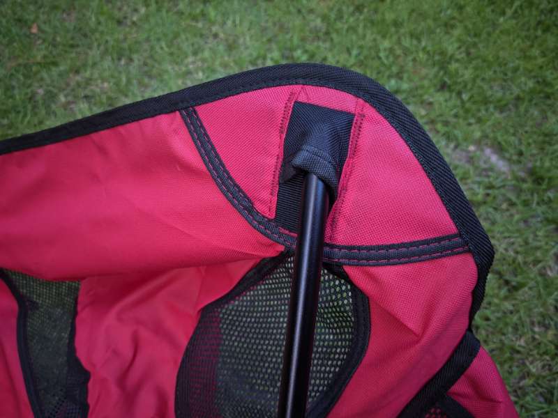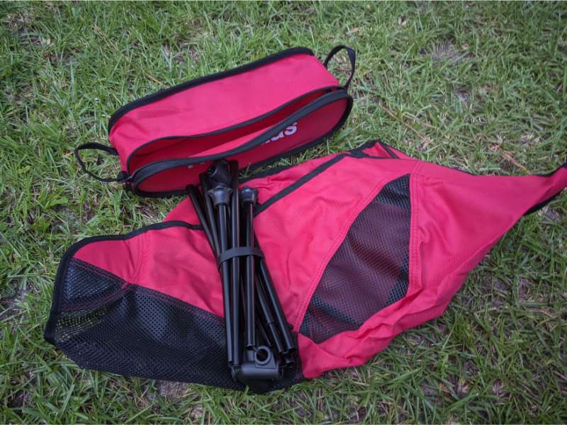 A mesh pocket is sewn into the left & right side of the chair, and it’s handy for holding odds and ends like keys, snacks and your phone. There’s also a Velcro loop attached to the middle brace of the chair’s frame, which you can use to secure the carrying bag so it won’t get lost.
