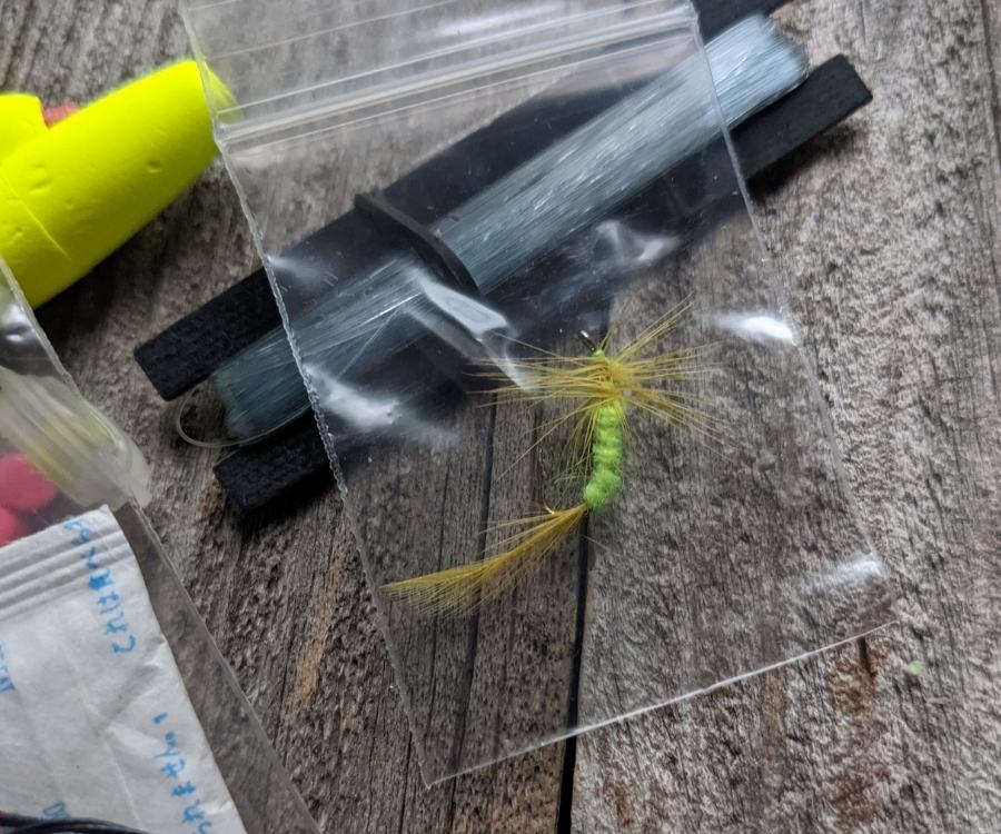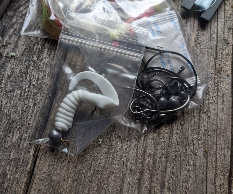 The lures, hooks and sinkers come packaged together or separately in four small zip bags, and the salmon eggs come sealed in a small plastic tube.