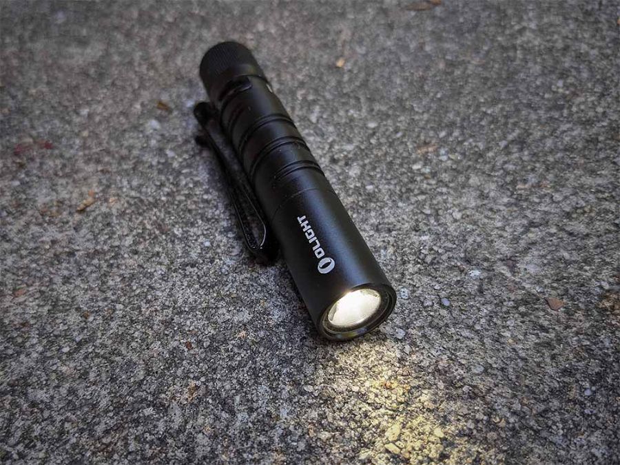 The Olight measures 3.5 inches from tail button to lens, which happens to be just about exactly the width of my palm. That makes it easy to grip while operating the flashlight with one thumb. Somebody with meatier hands might find it to be a little dainty, but for me it’s right in the sweet spot for everyday carry.