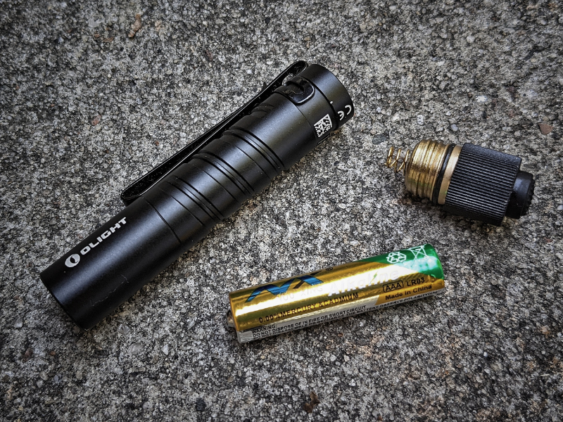 I didn’t personally test the flashlight with rechargeable Lithium batteries, but the folks at Olight strongly advise against it. So it’s good old AAAs for me! Besides, they’re cheap and available everywhere. The tail cap screws on and off very smoothly, making battery replacement quick and simple. The threads seem to be precisely cut, and I don’t anticipate any issue with mis-threading while putting the cap back on.