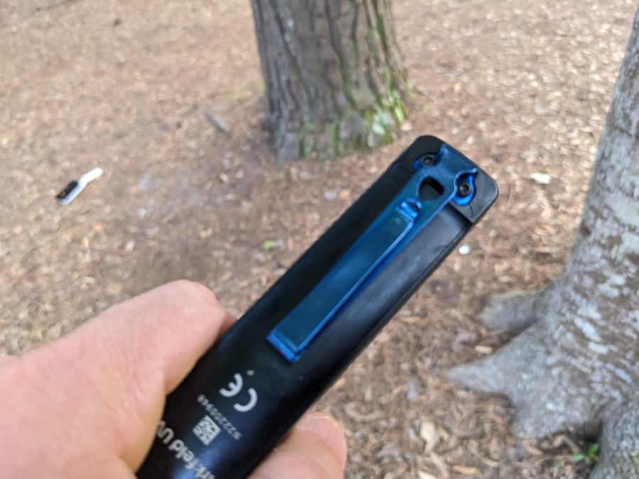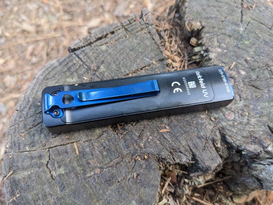 The Olight Arkfeld UV Flashlight measures 4.33 inches long, and the body of the flashlight is 0.98” wide and 0.59” thick. It weighs a fairly trim 87 grams (3.07 oz), and is constructed with anodized aluminum (multiple colors are available) with a stainless steel reversible pocket clip.