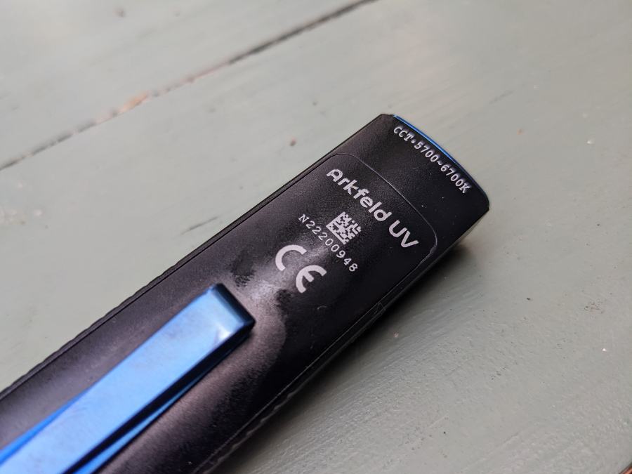 The shape of the Arkfeld UV jumps out right away. It could easily be mistaken for a small remote or a rectangular vape pen at a glance. It’s sleek and simple, with a power button and toggle switch conveniently situated right where your thumb rests along the barrel. The controls are fairly intuitive, and the max output of 1,000 lumens is very powerful.