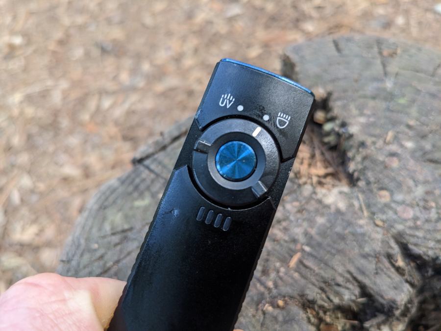 The white LED casts a nicely well-balanced, uniform beam, with a beam distance up to 85 meters. While the thumb button toward the forward end of the flashlight turns the light on and off and alternates between modes, the adjoining toggle switch will click the light back and forth between white LED and UV modes.