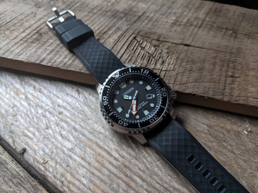 The dial is classic ProMaster utility: bold applied markers, framed day-date, and full-circle lume (they even give you a tiny plot beside the window). Citizen’s cool-blue glow is no joke—bright, even, and readable deep into the night. Stock rubber gets the job done, but the 20mm lug width makes it a strap playground: FKM, NATO, canvas—have fun.