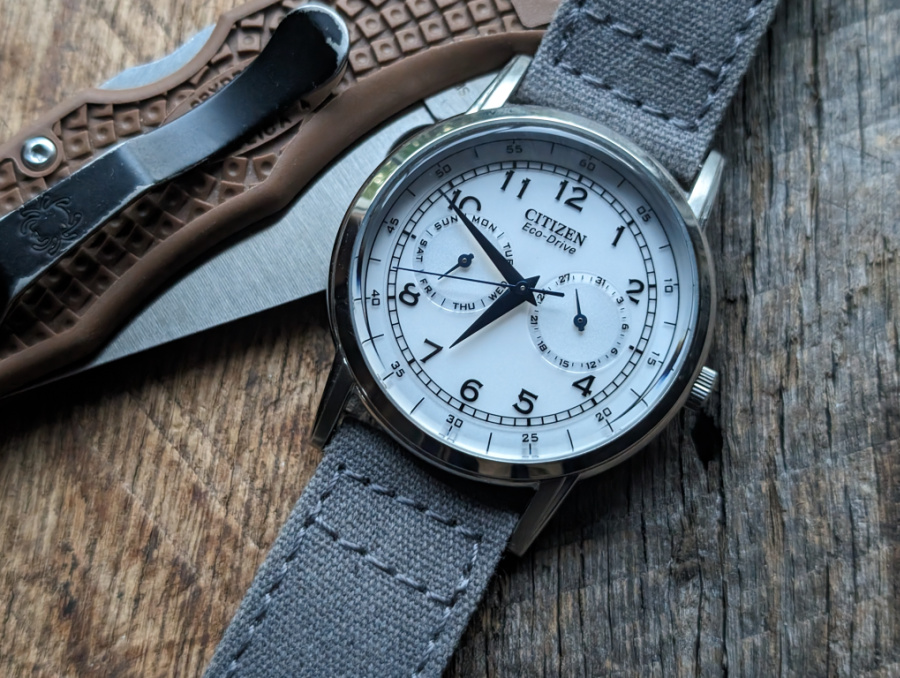 It runs on Citizen’s Eco-Drive, meaning light-powered accuracy with no battery swaps and up to six months of reserve on a full charge. The included khaki nylon strap is stiff out of the box but tough and serviceable, and the 22mm lugs make it easy to swap onto leather, NATO, or rubber to change the feel completely.