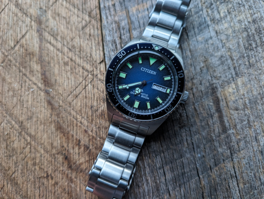 The dial is classic Japanese diver: bold trapezoid markers at the cardinals, fat hands, and a date down near 4. Everything is blasted with Citizen’s bright aqua lume that stays readable hours after lights out.