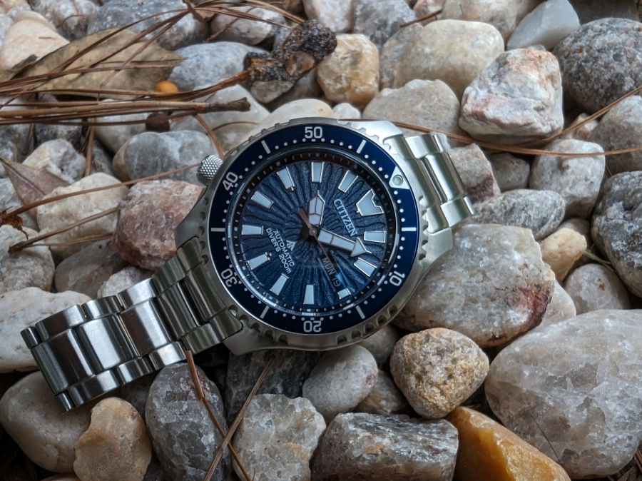 That ripple texture isn’t random—it’s inspired by the sand circles a puffer fish crafts on the seabed, echoed by the puffer on the caseback. On the wrist, the short, curved lugs keep it wearable, and Citizen gives you real upgrades where they count: sapphire with AR, a fully graduated aluminum insert, and their bright, long-lasting lume that glows hard all night.