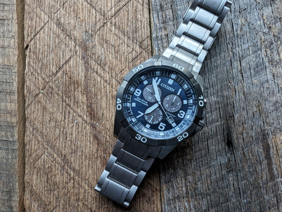Why I Picked It: It’s a titanium, solar-powered chronograph with lume that punches way above its class—a true everyday chrono that blends toughness with style.