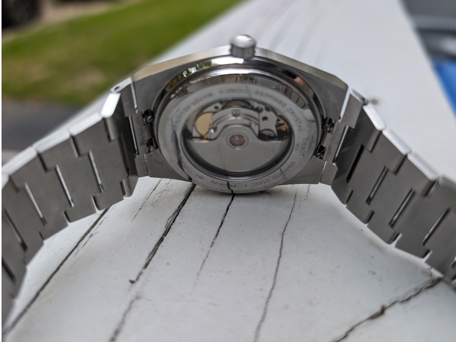 The PRX has a display caseback. The movement is not finished for show, but for someone new to mechanical watches it is neat to see the rotor spin. Personally, I would have preferred a closed caseback and an even slimmer profile, but I get why Tissot went this way.