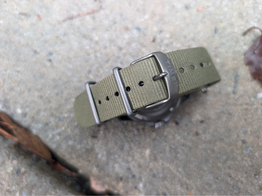 Now, let’s talk about the strap. Timex makes a point of telling you it’s made from 100 percent post consumer recycled nylon. They print eco conscious everywhere. Supposedly it’s about reducing carbon footprints and saving the planet.