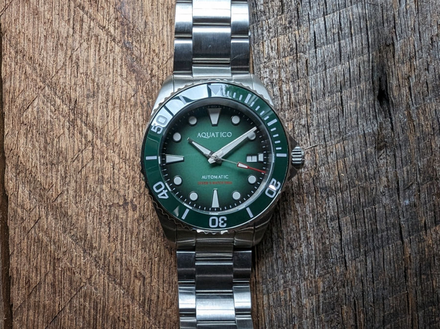 Aquatico is a small independent brand focused on producing rugged, tool-first dive watches. The Ocean Star measures 42 mm in stainless steel with a screw-down crown, 300 m water resistance, and a dependable Seiko NH35 automatic movement. It features a domed sapphire crystal, ceramic bezel insert, and a green sunburst dial that pops without being gaudy.