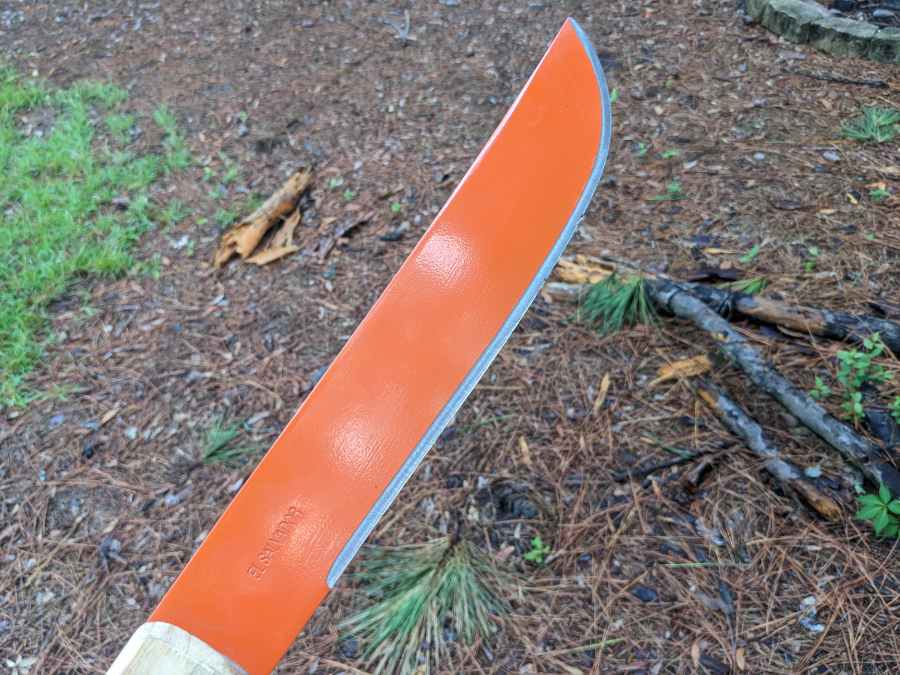 Like all carbon steels, 1075 is vulnerable to corrosion (though, again, less than 1095). The orange coating protects most of the blade other than the sharpened edge, so if you get your machete wet, just dry it off before you hang it up and you shouldn’t have to worry too much about rust.