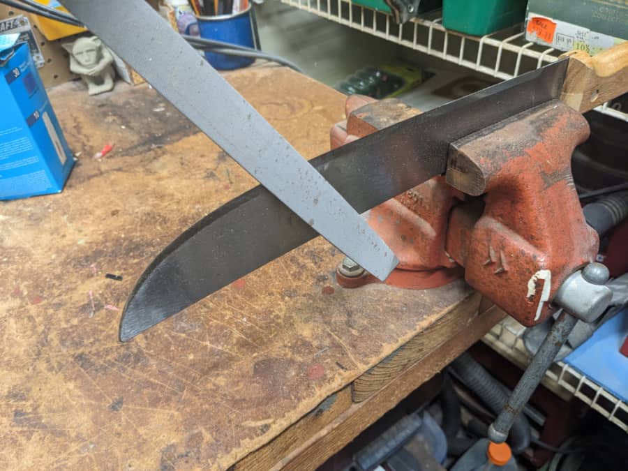 If you’re using a file, the motion will feel a little different. You’ll want to run the file along the blade in such a way that you are pushing the file across the grind toward the cutting edge while also moving it down the length of the blade.