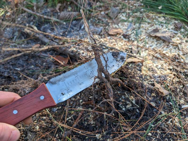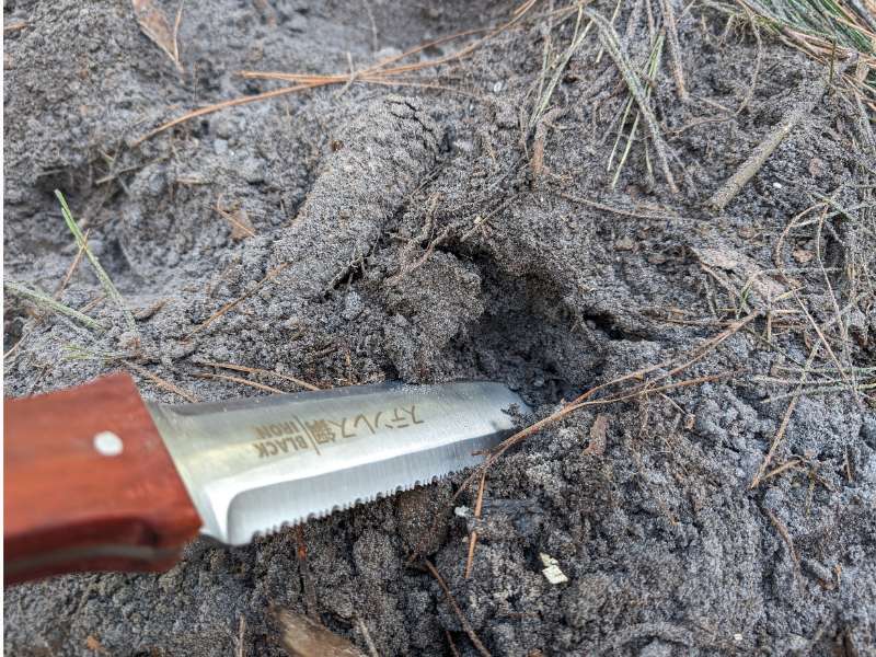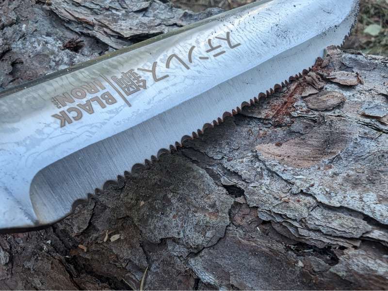 I will say that the Black Iron is quite a bit sharper than the Barebones was right out of the box. It’s by no means sharp enough to shave with, but it has a serrated edge and a beveled straight edge that are both sharp enough to slice through plant matter, and sharp enough to do a number on your hand if you forget that this is indeed a knife, and not merely a spade.