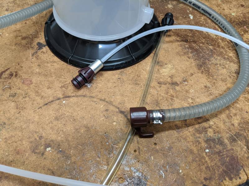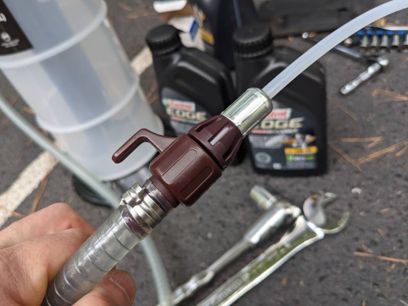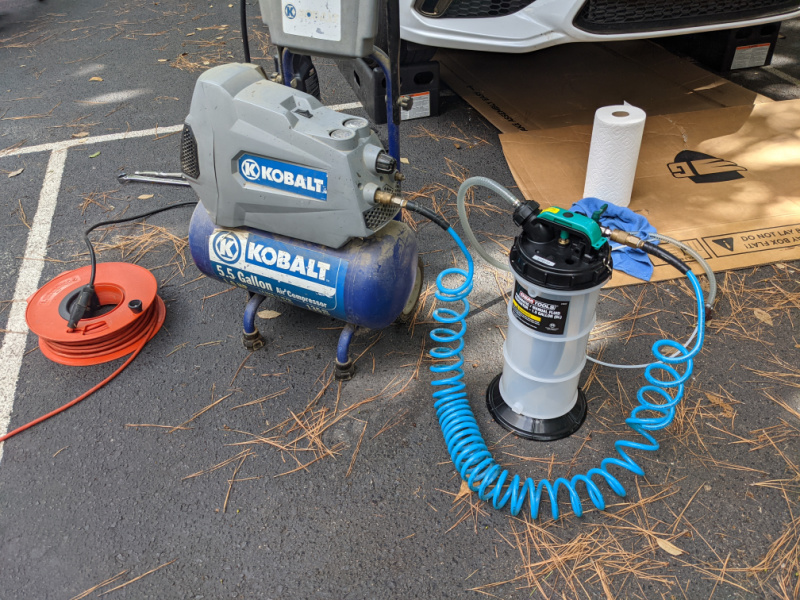 A quick note here, depending on the oil weight and fluid, you do not need to run the compressor the entire time you are extracting the fluid. The unit builds up the vacuum and will continue to extract fluid. However, it will keep it running at a higher volume if you keep the compressor on. I have used the OEM Tools extractor twice and both times I used a small compressor from Lowes and it was more than adequate.