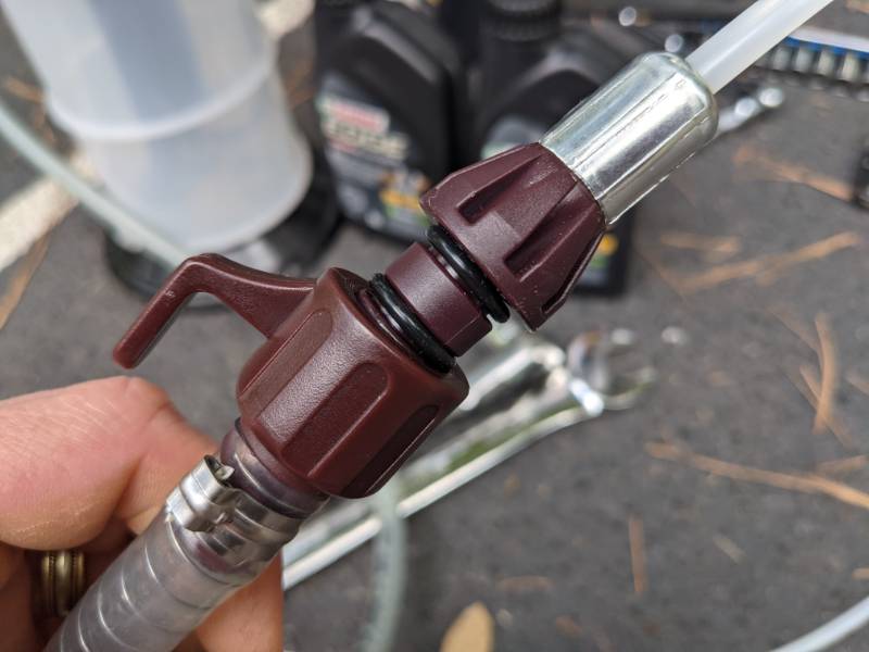 No fancy packaging here and even less in the directions category. There is a small pamphlet that is supposed to be directions, but it is short and vague. I did have a little trouble setting up the hoses because it’s unclear whether the main vacuum tube fitting goes over or under the nipple. Sounds confusing, but you can see in the pictures I took. The OEM Tools fluid extractor comes with one main vacuum hose that you attach a smaller feeder tube that gets inserted in the dipstick or other orifice where you plan to pull the oil out of. The tubes are long enough for most fluid extraction tasks.