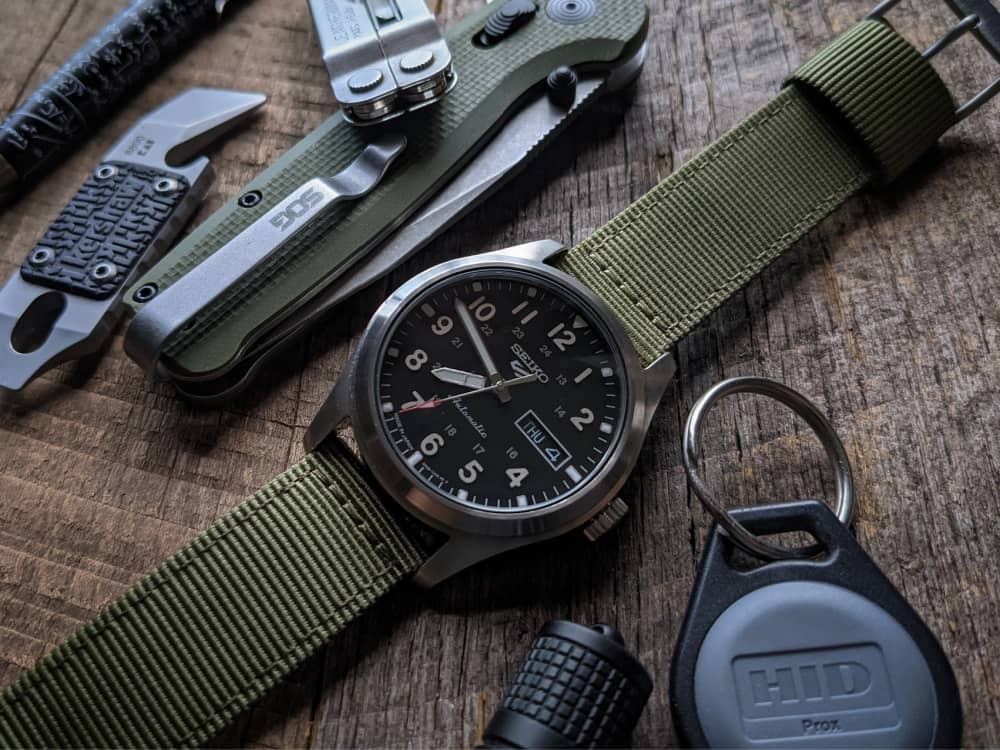 I have a real love / hate relationship with this watch, and some days I don’t know why I put it on this list. My main complaint…no screw-down crown! You would think with Seiko updating their field watch we could at least get a screw down crown. However, for the money, it’s not too terrible. I still think the Orient Defender would be a better choice, but for those of you that really want a Seiko, this will fill the void.