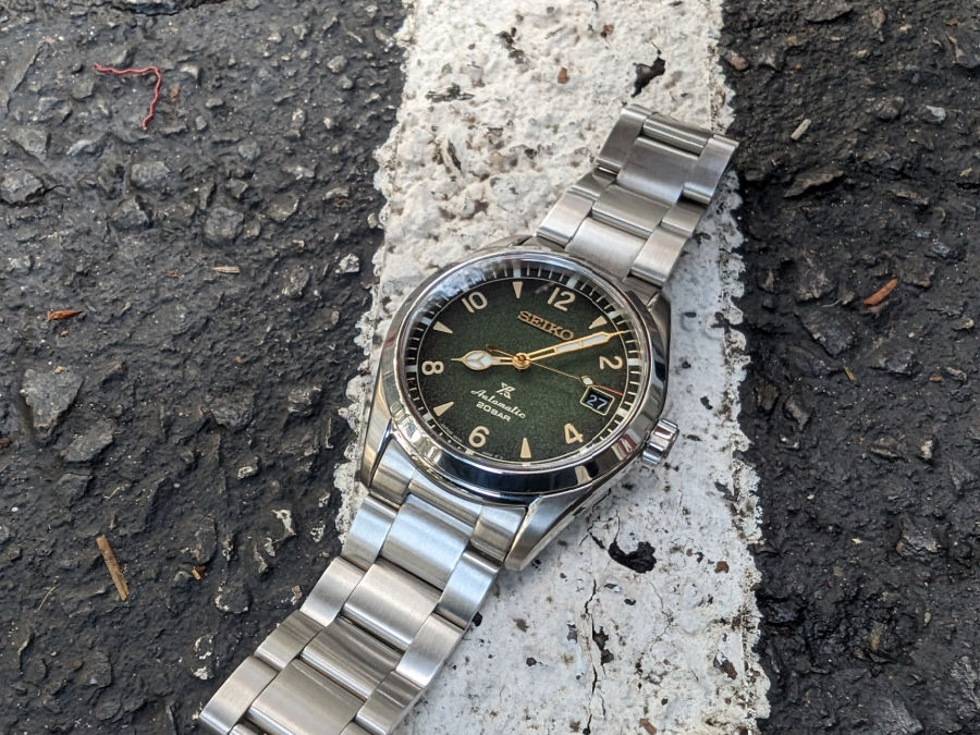 The Baby Alpinist is one of those watches that proves Seiko still knows how to make a field watch that looks sharp and works hard. At 38mm, it nails that sweet spot size that wears comfortably on just about any wrist. The green dial is textured and dynamic, shifting from deep forest tones to near-black at the edges, and it’s paired with cream indices and Seiko’s trademark cathedral hands. It feels purposeful but not fussy, the kind of watch you can wear hiking, fishing, or just running around town.