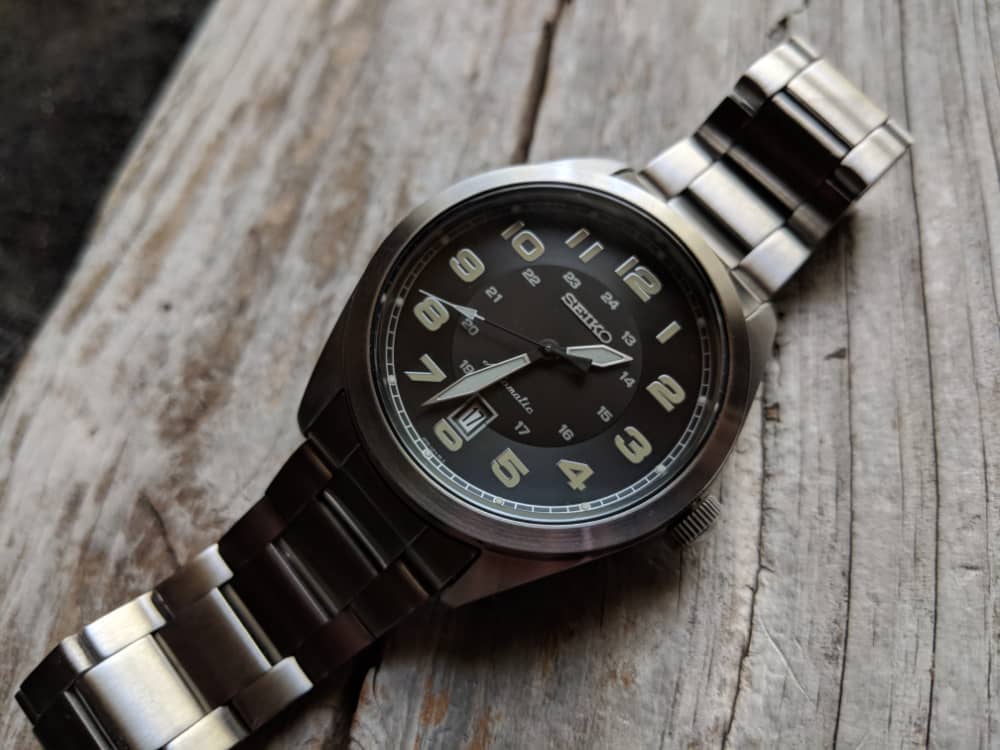 Thought I would put the SNZG15 on the list, didn’t you? You probably already know that’s a good watch, but this lesser known Seiko 5 is a killer. It comes on an OK steel bracelet, with great Seiko lume, total field watch look and, get this…the 4R35 movement! Now that the new Seiko 5 Field Watch came out, these are scarce. They pop up on eBay every once in a while and are worth hunting down.