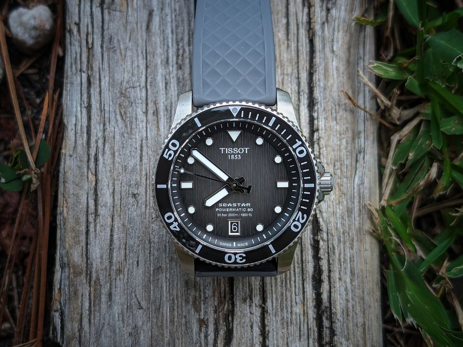 The watch comes on a cool tropical rubber strap, but I still swapped it out for a Barton Silicone Quick Release. The tropic strap looks great, but I didn’t like how the keeper kept sliding off and allowing the tang to flap around.