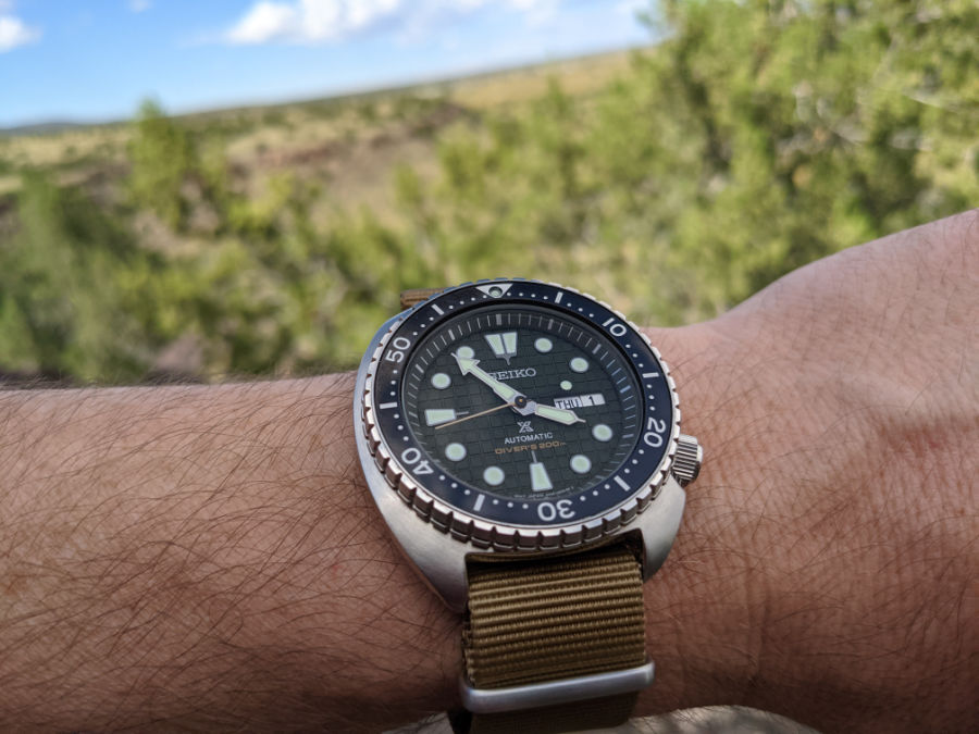 - Bezel and Crystal: The first notable difference between the King Turtle and the regular Turtle is the bezel and the crystal. The King Turtle typically has a ceramic bezel, known for its toughness and resistance to scratches, compared to the regular Turtle’s stainless steel bezel. Additionally, the King Turtle model features a sapphire crystal, which is more scratch-resistant and durable than the Hardlex crystal used in the regular Turtle models. You will notice in my picture I removed the cyclops, I hate them!