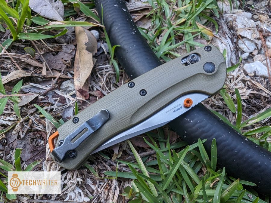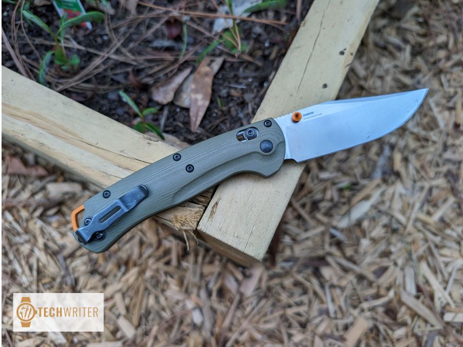 Right out of the box, the Taggedout feels like a bigger, clip-point cousin of the Bugout. If you’ve owned the Bugout or the Crooked River, you’ll recognize the DNA here instantly. OD green G-10 scales, orange anodized aluminum backspacer, and a long, thin clip-point blade. It looks cool — very “Benchmade tactical.” The Axis Lock is as fidget-friendly as ever and came smooth and perfectly centered.