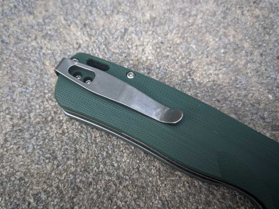 It has an ambidextrous deep carry pocket clip, which holds the knife way down deep inside your pocket. The pocket clip is held between the scale and the liner, allowing the clip screws to be recessed into the scale, which is a great design.