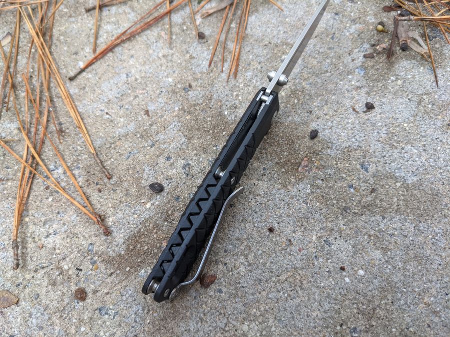 Out of the package, the Zilch isn’t a bad-looking knife. It’s got a good footprint and is lightweight. The blade and pocket clip are stonewashed and the polymer handle has a cool criss-cross etching to it. I bought the black handle model but it also comes in red and a black blade/tan handle combination.
