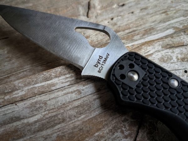 The first thing you notice about this knife is the teardrop-shaped thumb hole, as opposed to the classic circular thumb hole you would see on a Spyderco. The Byrd hole is, honestly, just kind of ugly to look at. The phrase “byrd 8Cr13MoV” is printed on one side of the blade in very clear font (it says “China” on the other side) so that anyone who’s a big enough knife nerd to know what that means can tell at a glance that the steel isn’t top of the line.