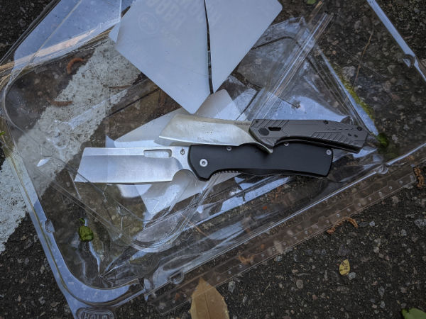 The cleaver blade shape makes both of these knives less likely to slip out while cutting cardboard—come to think of it, they’re very similar to the shape of an actual box cutter—which makes them perfect for that task. There’s just the slightest bit of “belly” to both blades, which also makes them good for any kind of chopping or slicing on a surface, i.e. prepping food.