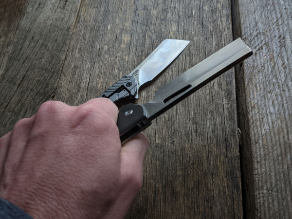 The Kershaw offers unassisted one-handed opening with a flipper and KVT ball-bearing. Give the flipper a little pull with your index finger, and the knife practically springs open by itself thanks to the ball bearing. I found the flipper to be a bit sticky right out of the box, but it loosened up after a day or two or repeated opening and closing.