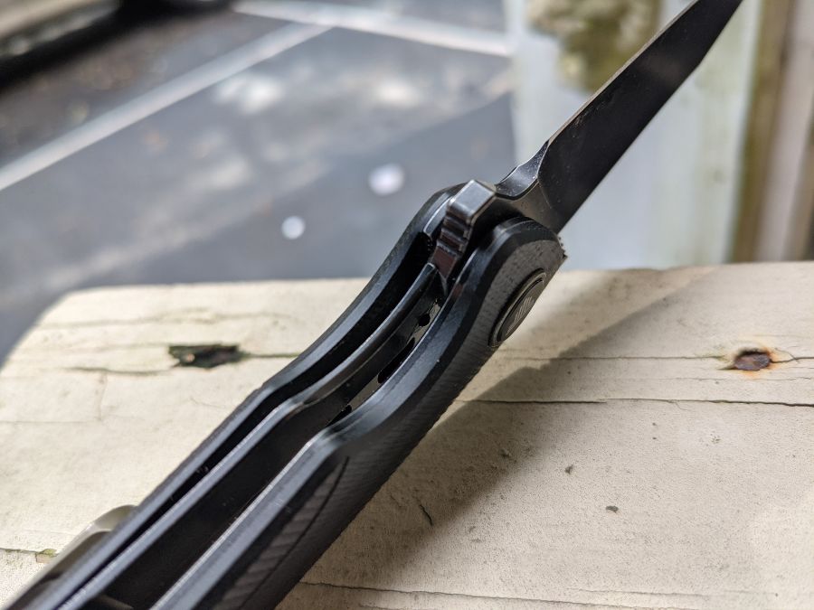 The liner lock on the Lynx-03B does not engage all the way when you open the knife. At first, I thought I just didn’t deploy the blade fully, then I thought maybe the knife action needed to be broken in more. However, after ample time, the lock-up is still subpar. In fact, I was able to get the lock to fail two times by hitting the backside of the blade on the edge of the workbench.
