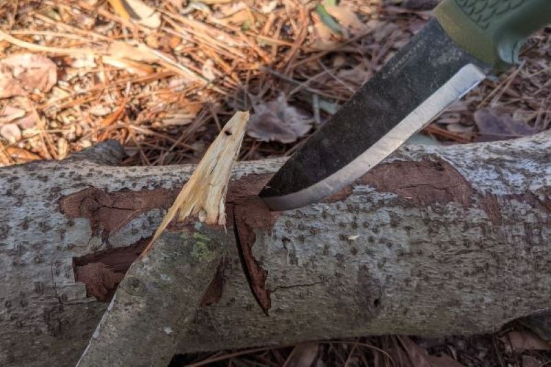 It’s also well suited to finer carving, chipping, shaving and making feather sticks. The spine of the blade is sharply squared off at 90 degrees, and I found it perfect for shaving tinder from dry wood. The spine also sparks nicely when struck with a Ferro rod, so this is a solid knife if you plan on using it as part of your fire starter kit.