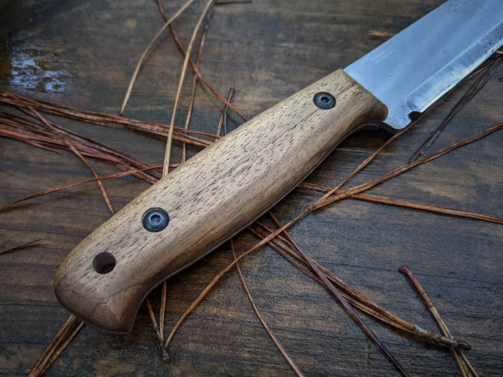 As I said, the BPS Adventurer is a full tang bushcraft knife. The scales are made of natural walnut wood, and are perfectly contoured to the tang so there’s no noticeable seam where the pieces meet. The wood is lightly finished with Danish oil, but has a nice raw, natural look to it.