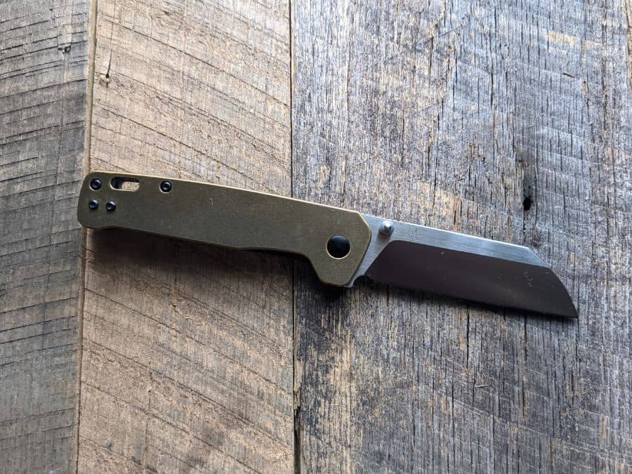 This is not the most flickable blade on deployment, but the copper washers definitely help out. However, I wouldn’t let that deter you from picking it up. The brass looks very cool and I love the blade shape. It’s a sheeps foot with a high grind that makes it very slicey.