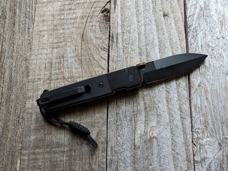 And it’s just a beautiful knife. The black G10 handle has a phenomenal grip texture, and the spear point blade is made of AR-RPM9 steel (good stuff, a little soft but easy to sharpen) with a flawless black BPD protective coating. At 3.18 oz with a closed length of 4.13″ it’s perfect for everyday carry.