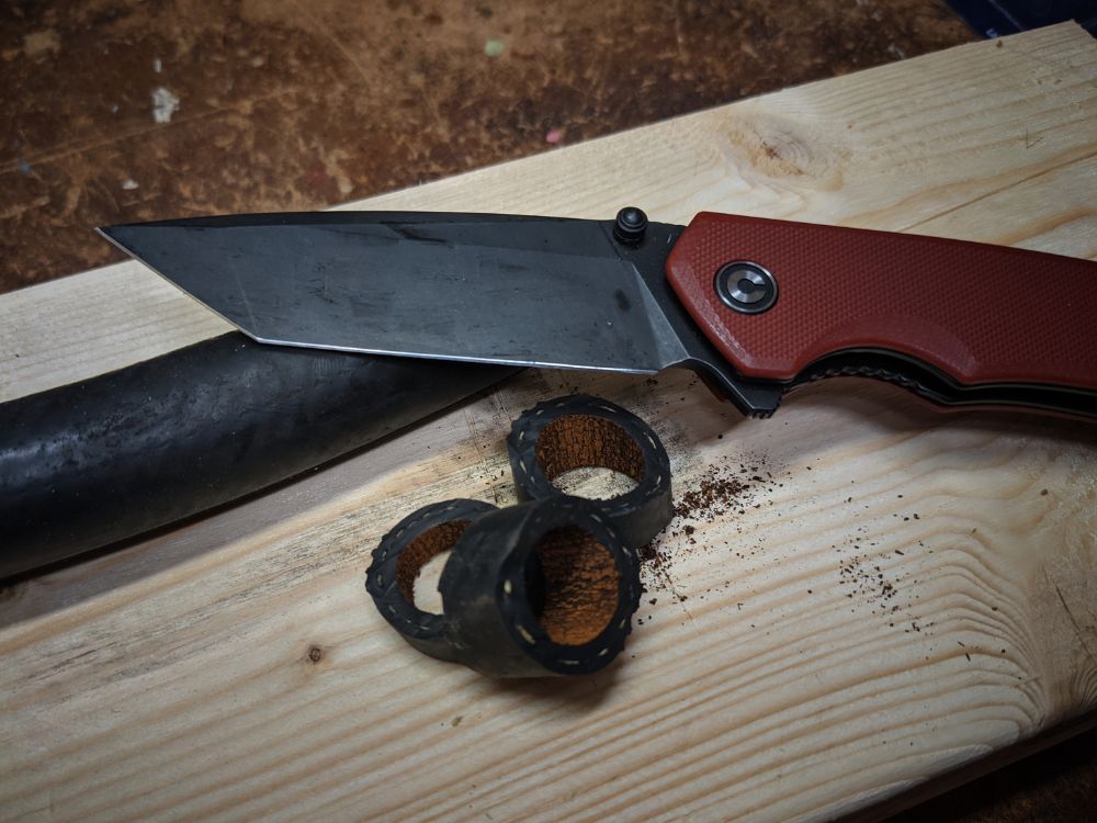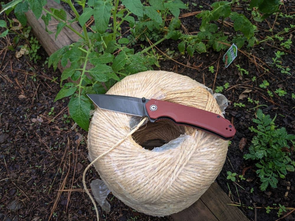 The knife didn’t make it through a normal Saturday morning of chores without needing to be sharpened again. After cleaning the garage, breaking down a bunch of boxes, cutting out old carpet from my son’s truck and cutting it so it would fit in the trash, then cutting twine for tomato plants, the blade was very dull. I have other D2 blades that have shown better performance, most notably my OKC Rat2.