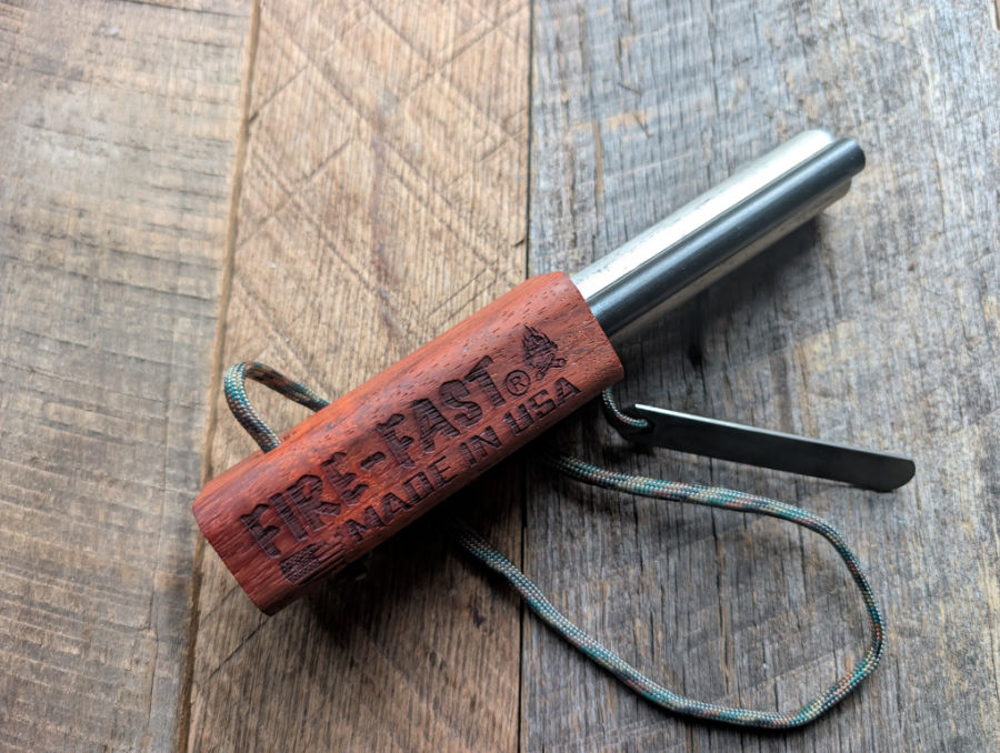 The Fire-Fast Trekker is a no-nonsense, overbuilt fire starter meant for real-world conditions, not fair-weather camping. The ferro rod throws large, reliable sparks, the hardened striker actually grabs instead of skidding, and the magnesium rod adds a serious heat advantage when tinder is damp or marginal. The hardwood handle provides excellent grip with cold or wet hands and adds a small emergency tinder option when everything else is soaked. It’s heavier and pricier than basic ferro rods, but durability and ease of use are clearly the priority here.