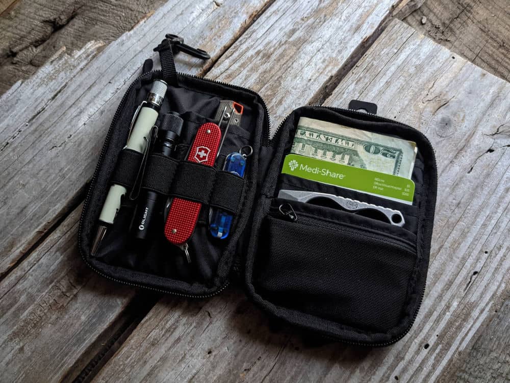 This thing holds a surprising amount of gear for its size, which makes it a very useful EDC organizer. I typically keep a knife, flashlight, lighter and writing utensil in the elastic loops, and a small notebook in one of the insert pockets. The Picofire holds a multitool nicely, though I more often keep a pair of my beloved Knipex EDC pliers in there.