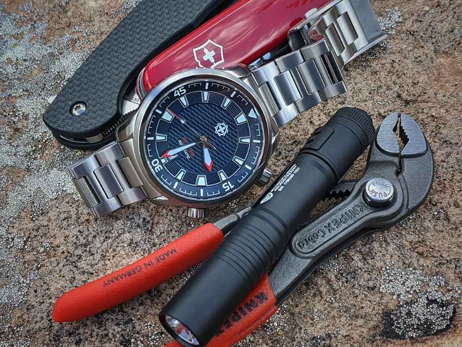 What sets apart the Giant Stride, and part of what gives it its charm, is that it’s a dual crown diver. Not only a dual crown, but a screw-down dual crown where both crowns screw and lock down tight. Many of the compressor/dual crown divers out there in this price range don’t have both dual screw down crowns, usually the second crown is non locking. I really think this is a nice touch that’s also very functional in the real world.