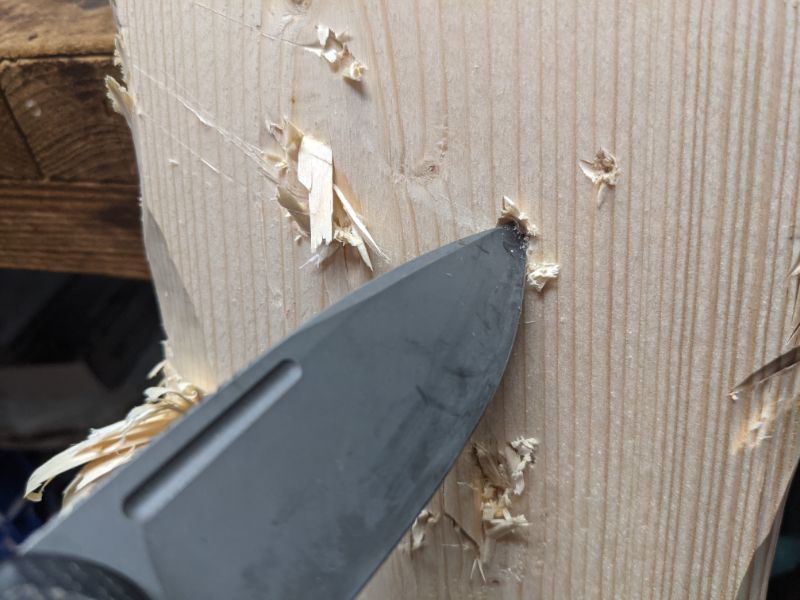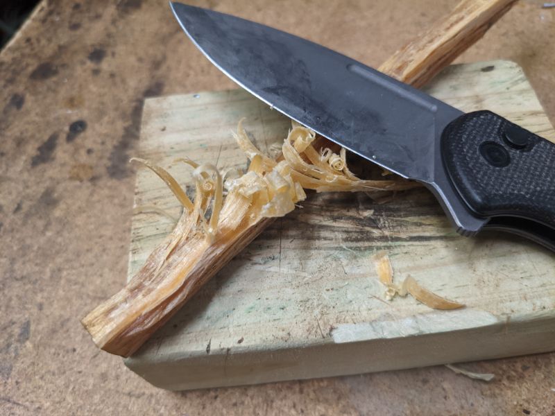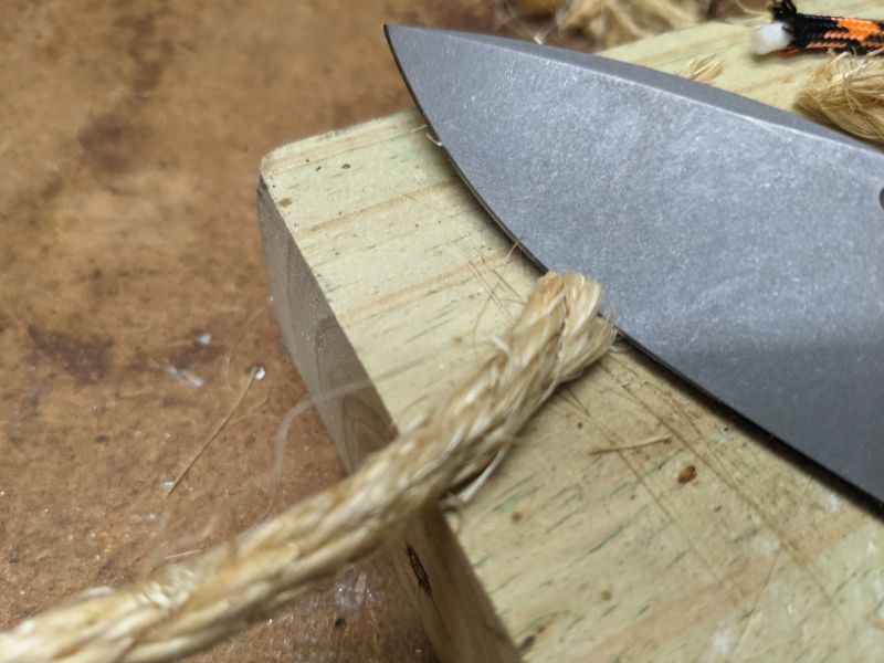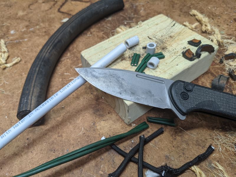 After the essential battery of cutting tasks, I ramped it up. I had to figure out what was going on here and why was my experience with the knife so different from other reviewers. I started cutting heavy-duty cordage, sandpaper, plastic tubbing, fire starter sticks full of sap, and aluminum cans.