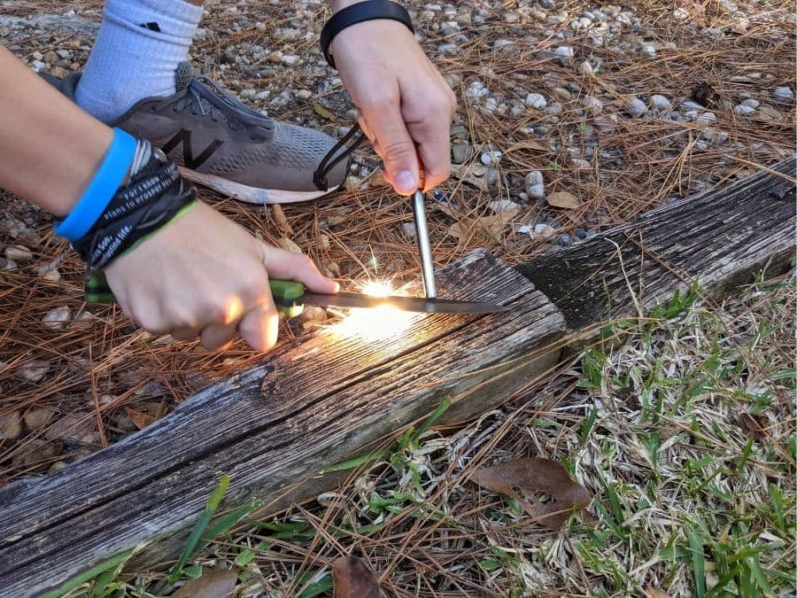 The spine is squared off, so it makes a good spark off a ferro rod. Contrary to some other reviews of this knife I’ve read, you don’t have to remove the black powder coat to make a spark. That being said, the act of striking the knife against a ferro rod will start to remove the coating anyway.