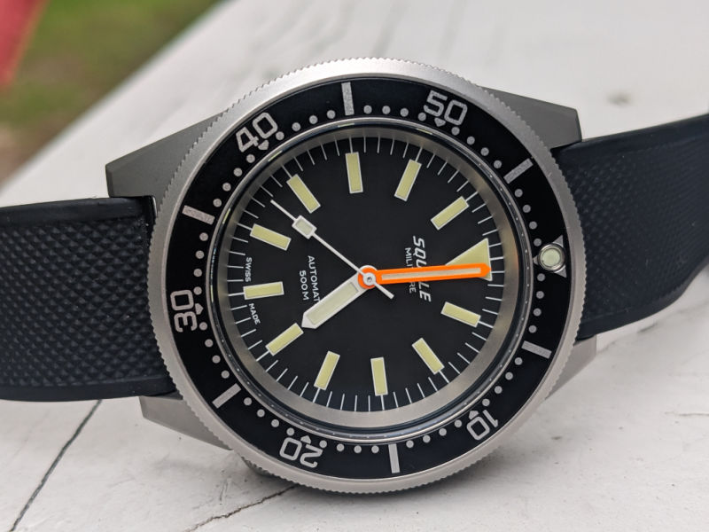 So when I started to pick that one perfect vacation watch for me, my rabbit trail ultimately led me to the newer Squale 1521-026-MIL-B, the 500M, no-date, bead-blasted beauty you see here. It is also one of the versions where Squale drops the second logo from the dial, which I love.