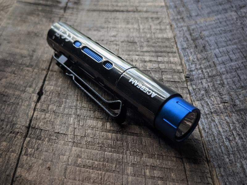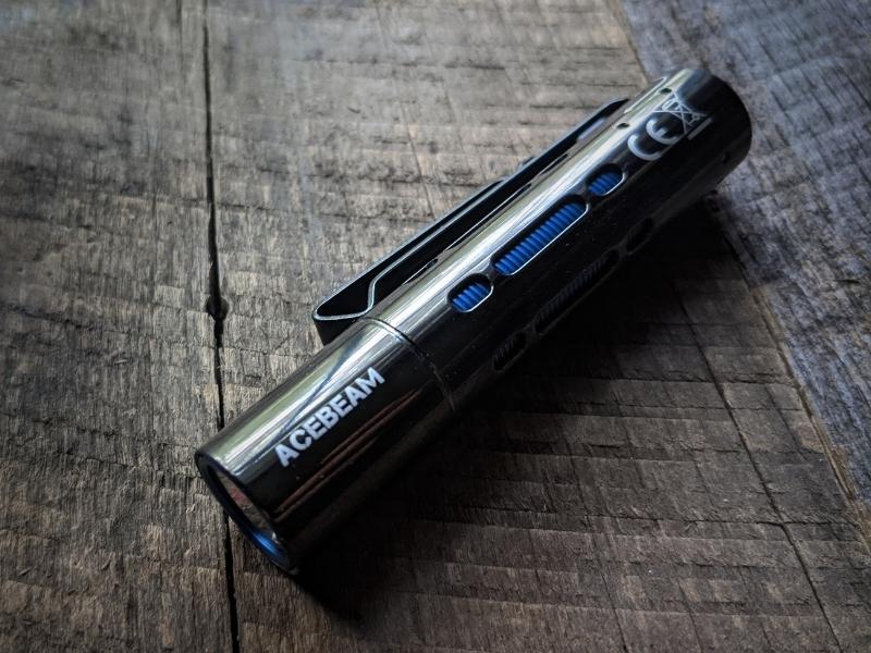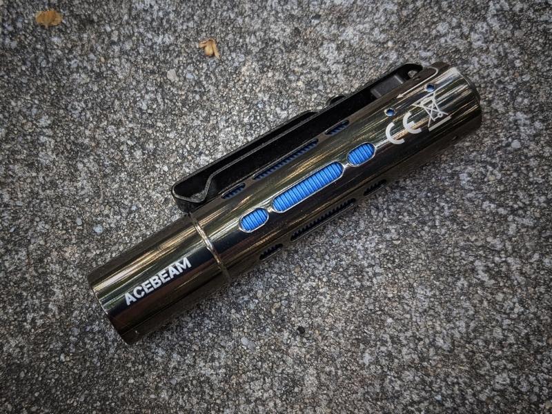 The outer shell is made of stainless steel, and the inner body of the flashlight is aluminum. It comes in multiple colors, but I went with basic black. The inner aluminum part is blue. The Acebeam Rider RX also includes a two-way stainless steel pocket clip.