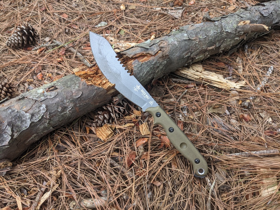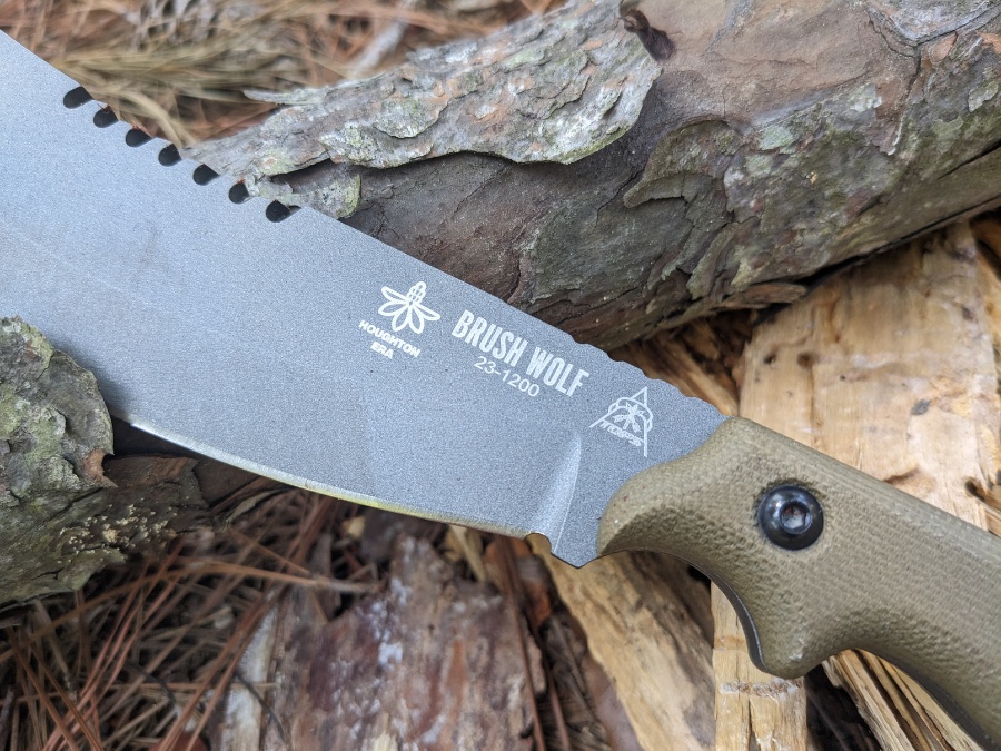 After months of use, the Brush Wolf has proven tough. The edge holds up well to wood processing, and while 1095 steel will stain if you neglect it, the acid rain finish and a little care keep it looking sharp.