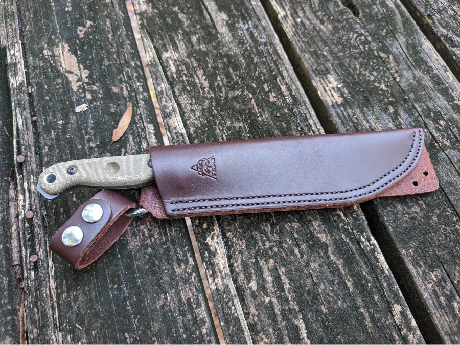 The Micarta grips haven’t loosened or worn, and the leather sheath is aging beautifully with use—darkening and softening in a way that only high-quality leather does.
