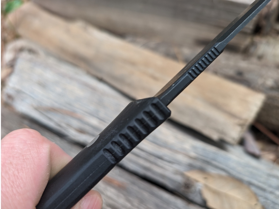 The G-10 handle is one of the Tamashii’s standout features. The bell-shaped design locks into the hand naturally, whether you are in a fencing grip, reverse grip, or choked up for detail work. The jimping on the spine is just aggressive enough to keep your thumb in place without being uncomfortable.