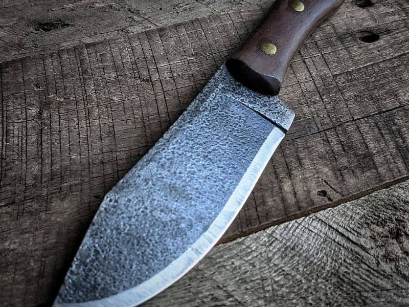 The walnut wood handle is held to the blade’s full tang with three brass pins. The blade is made of 1075 high carbon steel, and has the Condor Classic finish, which the folks at condor describe as being created using “hand powered equipment” to give the appearance of a hand-forged blade.