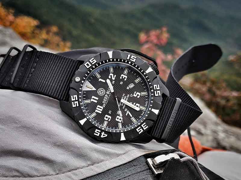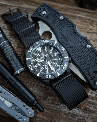 It’s light on the wrist, the lume is utterly outstanding, and it’s good-looking! If you like a tactical, adventure-looking watch, then this is for you. The black on black case is well done, and the white markings on the dial really stand out.